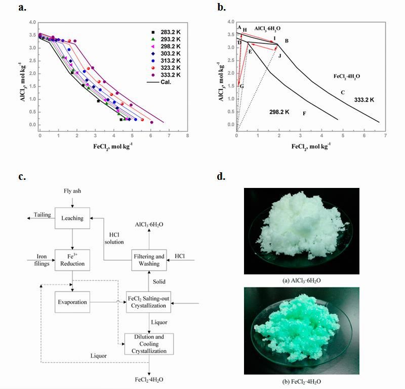 c. 粉煤灰提取氧化铝新工艺流程图; d. AlCl3·6H2O及FeCl2·4H2O产品照片。