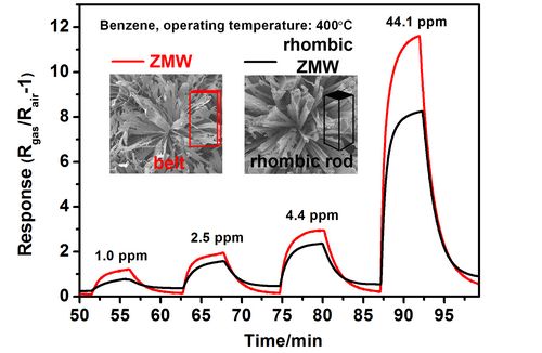 提升灵敏度以检测低浓度有毒有害气体是目前金属氧化物气敏传感器的一个重要发展方向。U9彩票材料化学与应用技术创新团队利用水热-模板法制备了单层有序的ZnO微型防风林型气敏传感器,该材料可直接测量痕量(小于100 ppb)苯气体并具有良好的响应和恢复性能。