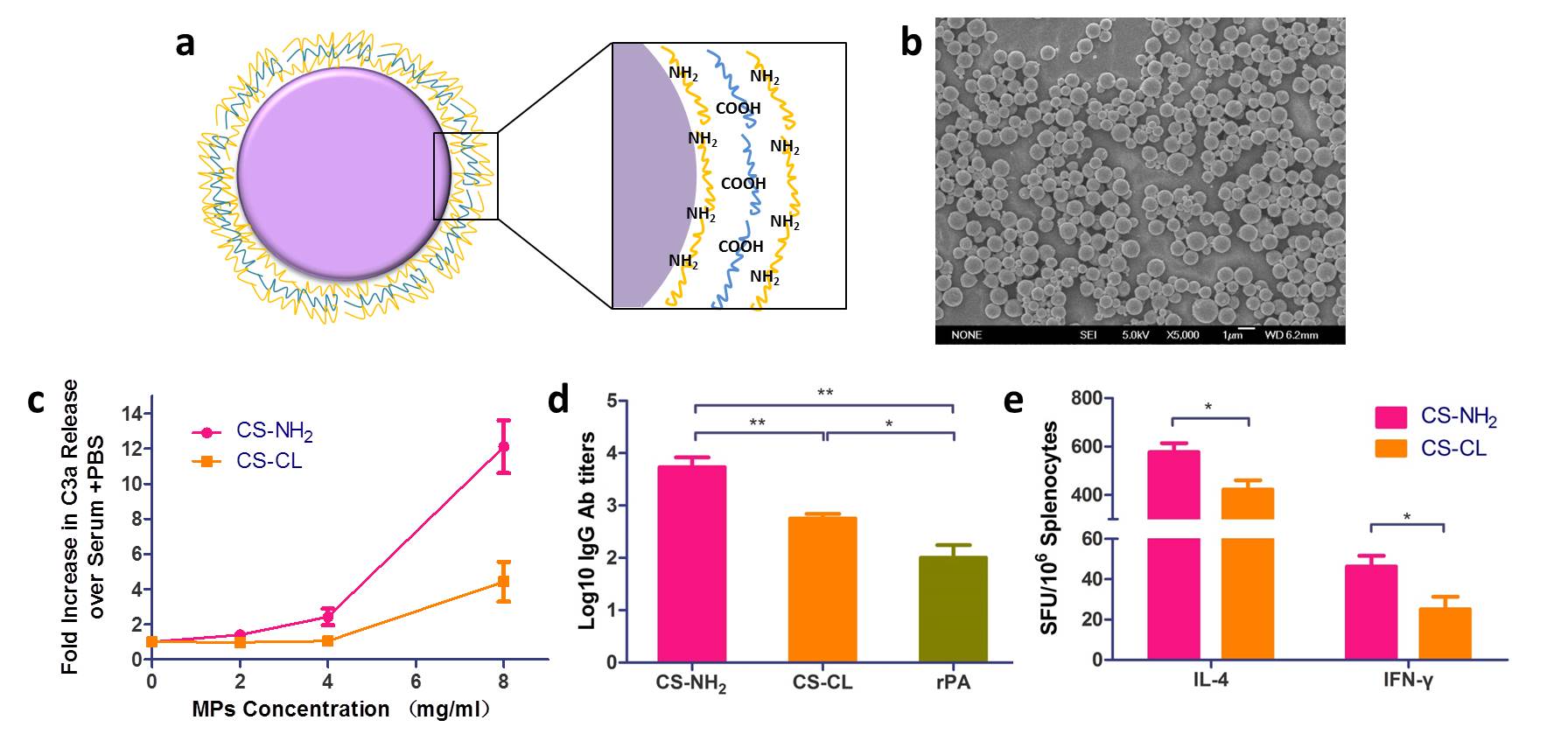 a. 颗粒结构示意图; b. 颗粒的SEM形貌;c. 补体活化实验结果; d. 抗体水平; e. 细胞因子水平