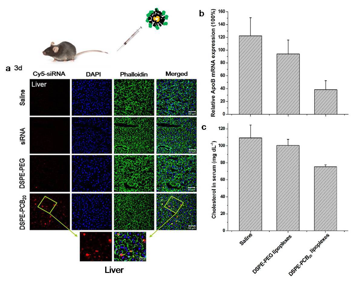 a) DSPE-PCB阳离子脂质体/siRNA的肝部分布图;b) 肝部ApoB mRNA的表达量;c) 血液中胆固醇的含量。