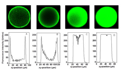 激光共聚焦显微镜图像,介质与颗粒直从左到右径依次是DEAE-FF, 97 mm,DEAE-Capto, 105 mm, DEAE-AP-120 nm, 107 mm, DEAE-AP-280 nm, 92 mm.