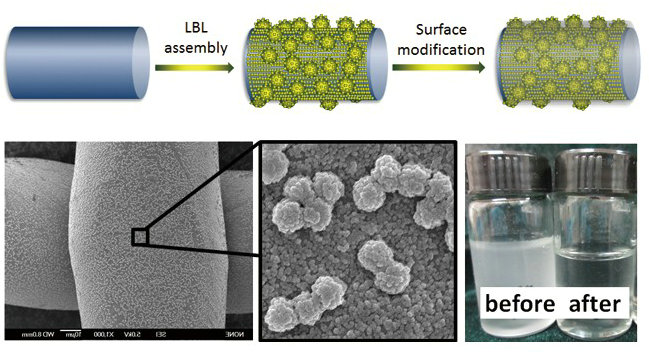 近日,过程工程研究所杨传芳研究员的纳米工程污染物控制技术课题组以层层自组装的方法,将SiO2纳米粒子在不锈钢丝网和烧结纤维毡表面,构筑成阶层粗糙的表面纳微结构,并以气相沉积的方法赋予材料表面特殊的浸润性能,来增强材料对油水混合物的高效分离和水包油乳液中微小油滴的聚并捕获。其中处理过的纤维毡对油水乳液的聚并分离效率可以达到99.4%,并且可多次重复使用和清洗, 为传统金属过滤材料的应用开辟了一个新的方向。相关研究成果被作为Advance paper发表在最近一期的Journal of Materials Chemistry A,(2014, DOI: 10.1039/c4ta01569j).