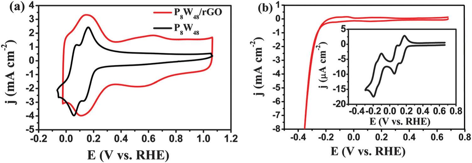 P8W48在P8W48/rGO/GC电极表面(“微环境效应”)以及体相溶液中的循环伏安曲线对比:(a)负电位极限为P8W48的8电子还原区域,(b)负电位极限为P8W48的16电子还原区域;(c)P8W48/rGO与其它催化剂的电催化析氢极化曲线对比;(d)P8W48/rGO电催化析氢稳定性测试。