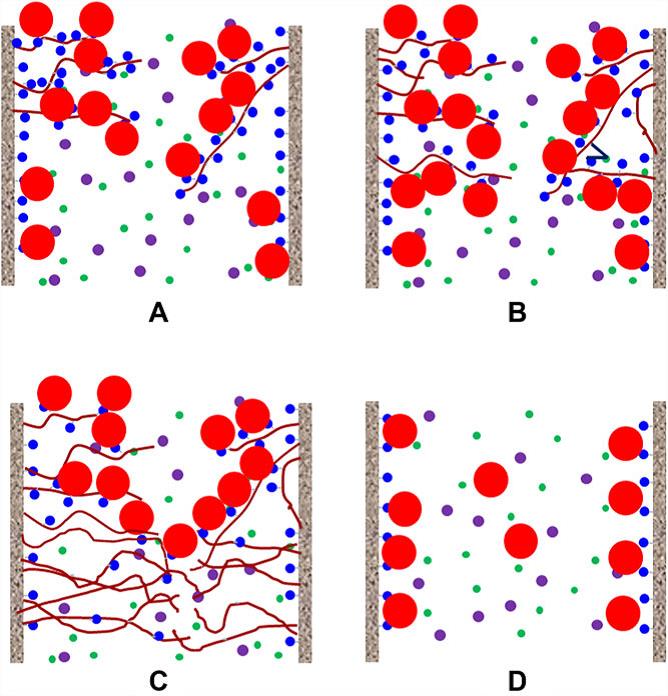 金属螯合层析介质结合蛋白机理示意图(A,B代表部分接枝葡聚糖金属螯合介质,C, D分别代表全部接枝葡聚糖金属螯合介质和未接枝介质。图例:蓝色圆-Ni2+;棕线-葡聚糖;红色圆-His-tagged LDH;紫色圆-杂质I;绿色圆-杂质II)