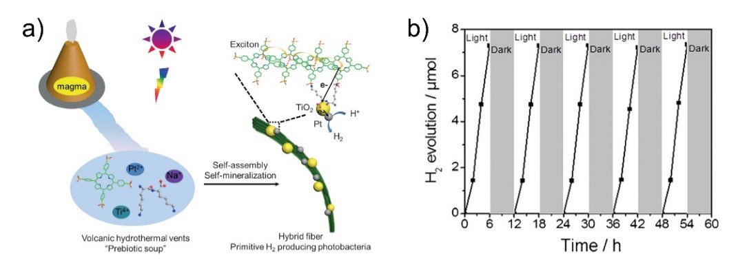 在国家自然科学基金委、中组部和中科院的大力支持下,中科院U9彩票的闫学海研究员团队在基于生物分子组装的仿生光合成和抗肿瘤治疗方面取得系列进展。研究人员受天然蛋白质调控色素分子自组装的启发,提出了寡肽调控卟啉自组装构建仿生功能体系的策略。通过对寡肽亲疏水性的合理设计,实现了分子、纳米和微米尺度有序自组装结构的构建,获得的长程有序自组装纤维束具有光学各向异性、手性放大、大斯托克斯位移、增强的光稳定性和光催化活性等特性(Angew. Chem. Int. Ed. 2015, 54, 500–505)。进一步研究表明,这种寡肽调控卟啉自组装的过程在模拟火山热液的环境中能够高效地进行,获得的多尺度组装结构在酸性、高温和高盐的条件下稳定,并且能够通过原位矿化整合二氧化钛和铂纳米颗粒。杂化组装体中卟啉和纳米颗粒的有序排布与绿色硫细菌中绿色体和反应中心蛋白的组织形式类似,实现了在苛刻条件下的光催化产氢(Angew. Chem. Int. Ed. 2016, 55, 12503–12507,图1)。因此,肽调控卟啉自组装的多尺度有序结构一定程度上模拟了生物光合成系统,为研究原始光合成系统的形成提供了参考,并对仿生生物能源体系的构建具有重要指导意义(Adv. Mater. 2016, 28, 1031–1043)。