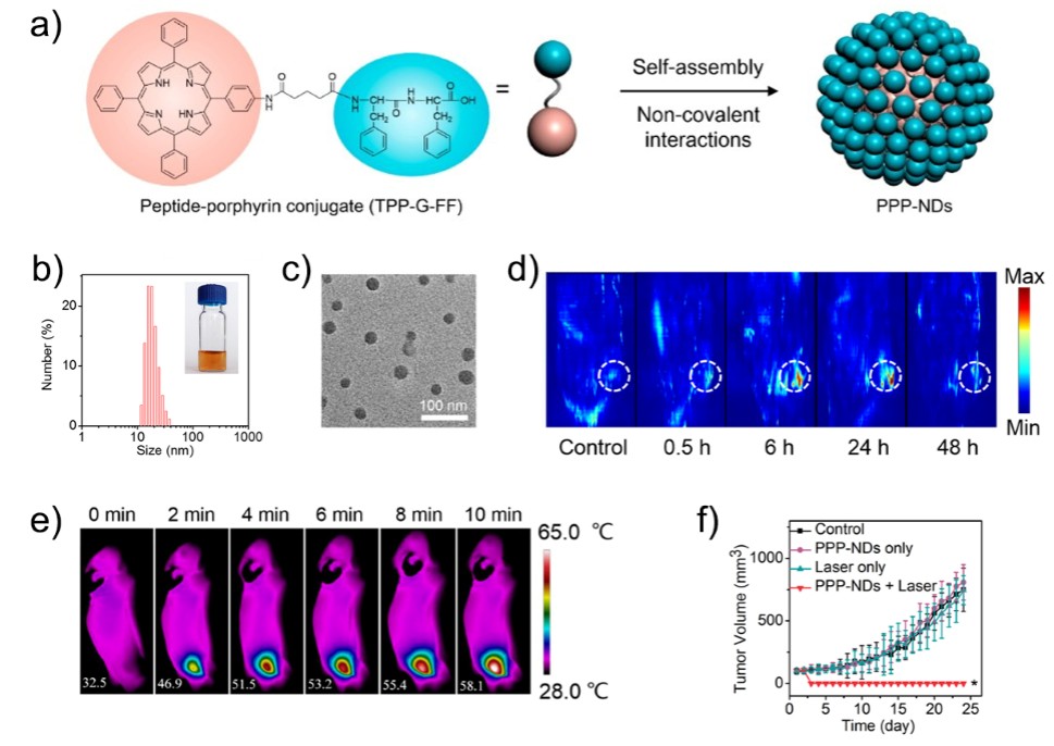 图2 基于肽-卟啉自组装的光热纳米点(PPP-NDs):a) 分子结构和自组装示意图;b) 粒径分布图;c) 透射电子显微镜图;d) 纳米点小鼠体内光声成像图;e) 纳米点用于光热治疗时小鼠热成像图;f) 纳米点用于光热治疗时小鼠肿瘤生长曲线
