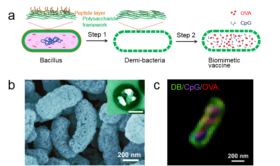图 1 仿生疫苗制备:a) 仿生疫苗构建示意图;b) 中空多孔DB的SEM照片;c) DB装载CpG和OVA的超分辨共聚焦照片。