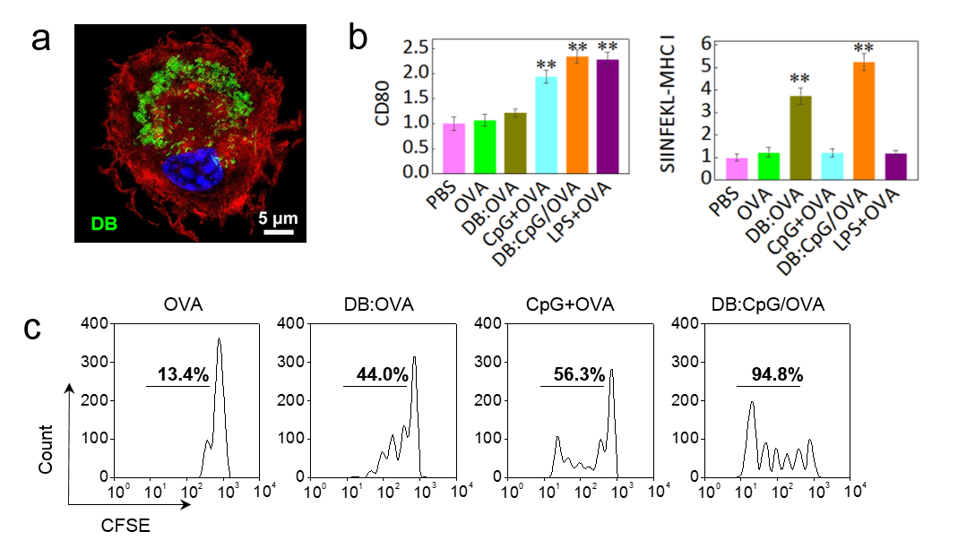 图 2 DB与免疫细胞的相互作用:a)DB被树突状细胞内吞后的共聚焦照片;b)DB刺激后树突状细胞表面共刺激因子与特异性MHC分子表达;c)免疫接种后小鼠体内特异性CD8+ T细胞的增殖情况。