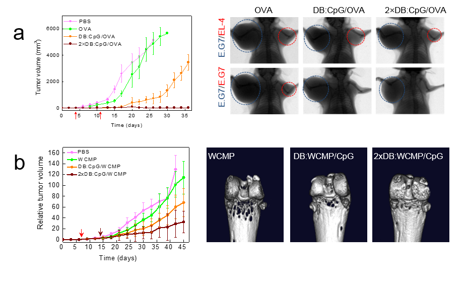 图 3 仿生疫苗抑瘤效果与抗肿瘤转移能力显著:a) E.G7肿瘤模型的抑瘤曲线与代表性肿瘤转移灶照片;b) 4T1肿瘤模型的抑瘤曲线及骨转移情况。