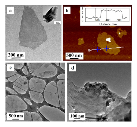 b) 少层石墨炔纳米片的AFM照片(插图显示厚度约为1.1nm; c) MoS2纳米片的TEM照片; d) 氧化石墨烯的TEM 照片.