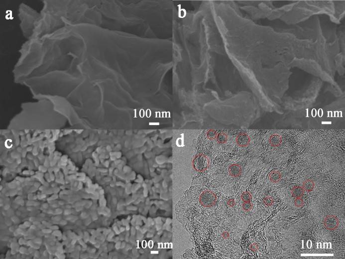 (a)NGr、(b)VN/NGr、(c)VN的SEM图,(d)VN/NG的TEM图