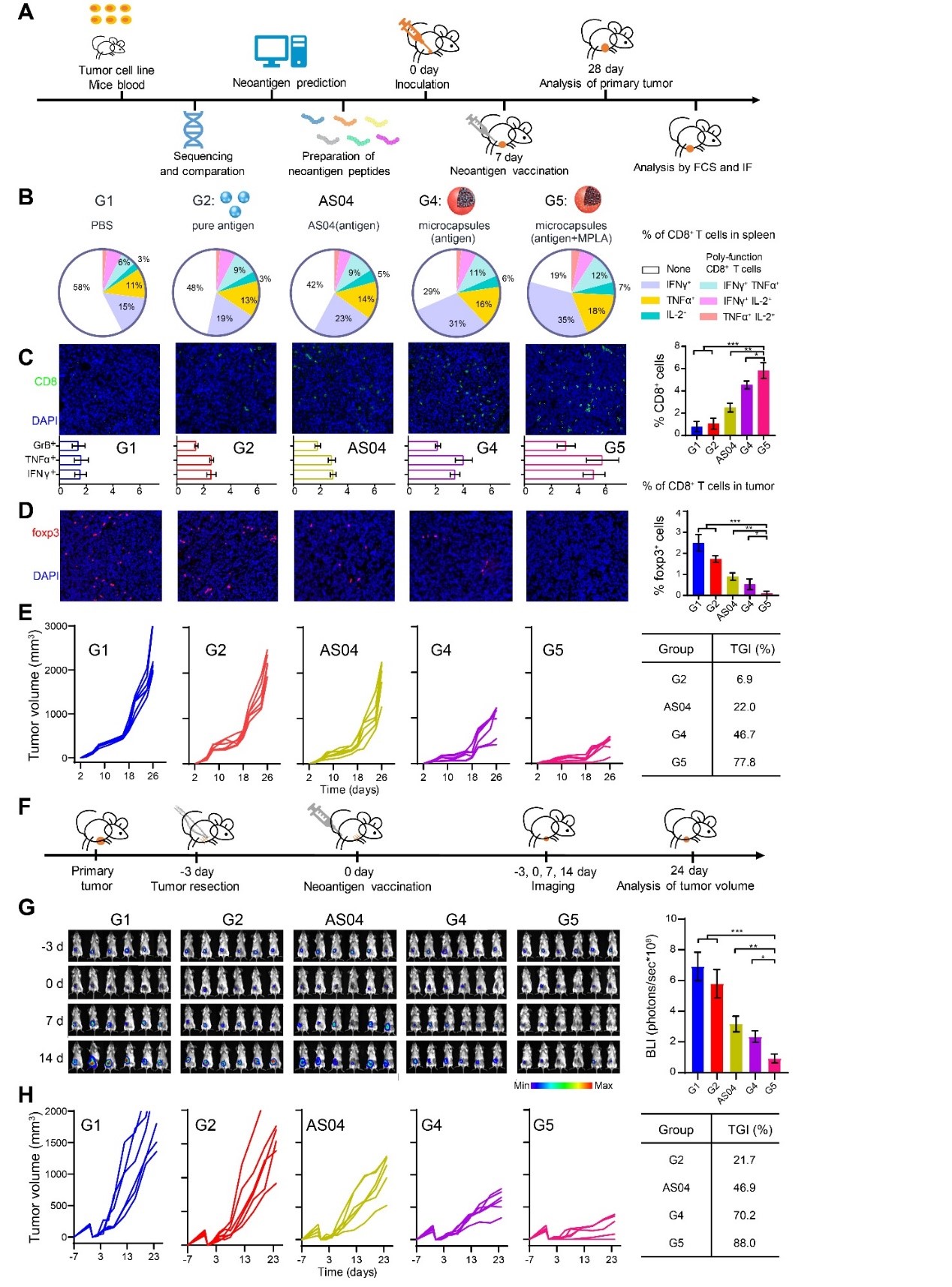 基于上述优势,该肿瘤疫苗剂型在动物模型上单次注射后即可诱导高效且长期的特异性免疫应答,在乳腺癌、淋巴瘤、黑色素瘤等多种肿瘤模型和蛋白抗原、多肽抗原、新抗原上取得了优于商品化剂型(AS04)的疗效,并且展示出了非常好的安全性。该剂型目前正在与医院合作申请临床伦理,用于肿瘤新抗原的个体化免疫治疗。