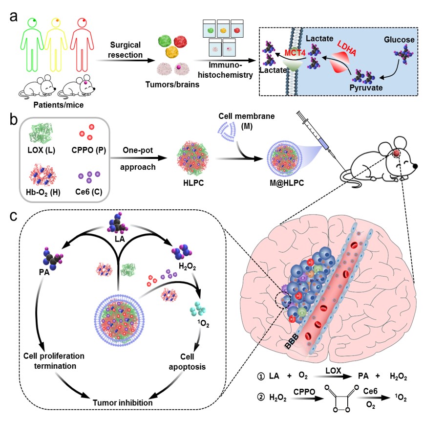 图1仿生剂型用于GBM代谢调控和靶向协同治疗示意图。(a)胶质瘤样本中乳酸代谢通路代表性指标分析示意图;(b)仿生剂型M@HLPC的构建示意图;(c)M@HLPC的抑瘤机制示意图
