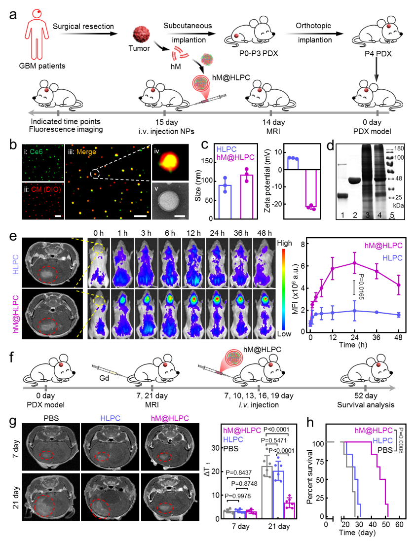 图2 个体化仿生剂型hM@HLPC在患者来源的异种移植瘤模型上的疗效评价。(a)模型的构建及靶向效果评估策略;(b-d)hM@HLPC的共聚焦和透射电镜成像、粒径电势及蛋白凝胶电泳;(e)小动物成像表征hM@HLPC在GBM部位的富集;(f)hM@HLPC在异种移植瘤模型上的治疗效果评估策略;(g, h)生长曲线及生存期曲线