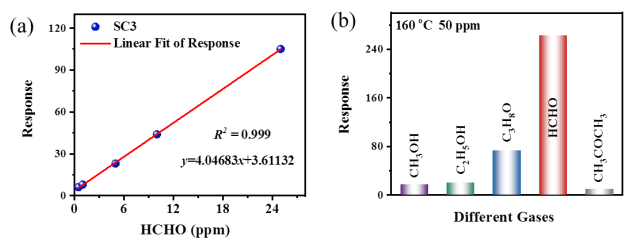 图1. 甲醛气敏响应灵敏度(a)与选择性(b)