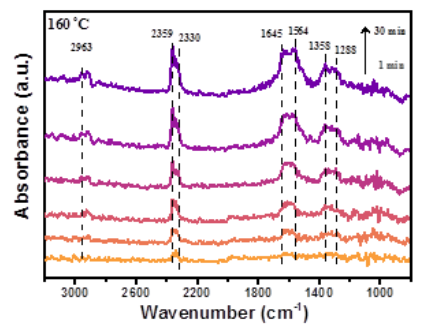 图2. 甲醛在气敏材料表面反应的原位红外光谱图。1358处为二亚甲氧基,1564与2963处为甲酸根,1645与1288处为碳酸根,2359与2330处为二氧化碳