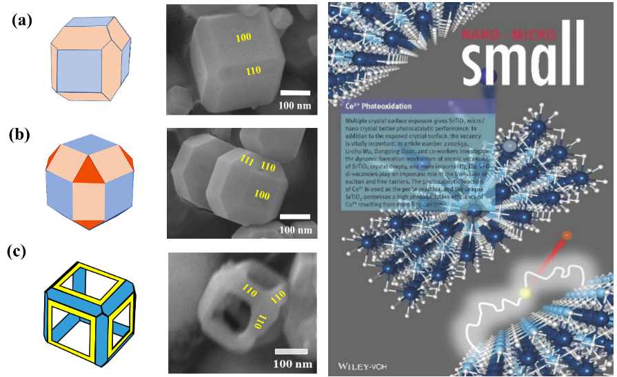 图 (a)十八面体、(b)二十六面体、(c)中空笼状SrTiO3的SEM照片;右侧为研究成果被Small选作的卷首插画。