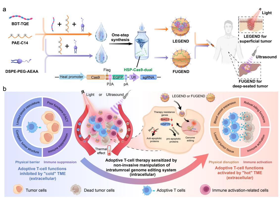 其中,针对浅表肿瘤,研究团队发展了光驱动型基因编辑纳米器件(LEGEND),采用“纳米器件瘤周注射+NIR照射”的方式,在黑色素瘤等小鼠肿瘤模型以及人源化的患者来源肿瘤异种移植模型上显著提升了肿瘤浸润T细胞和嵌合抗原受体T细胞两种过继回输T细胞疗法的治疗效果。针对深部腔内肿瘤,研究团队进一步发展了聚焦超声驱动型基因编辑纳米器件(FUGEND),采用“纳米器件静脉注射+FUS”的方式,在小鼠原位肝癌模型上同样证明了显著的ACT增效作用。