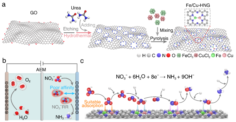 图1. Fe/Cu-HNG 的合成和电化学硝酸盐还原示意图