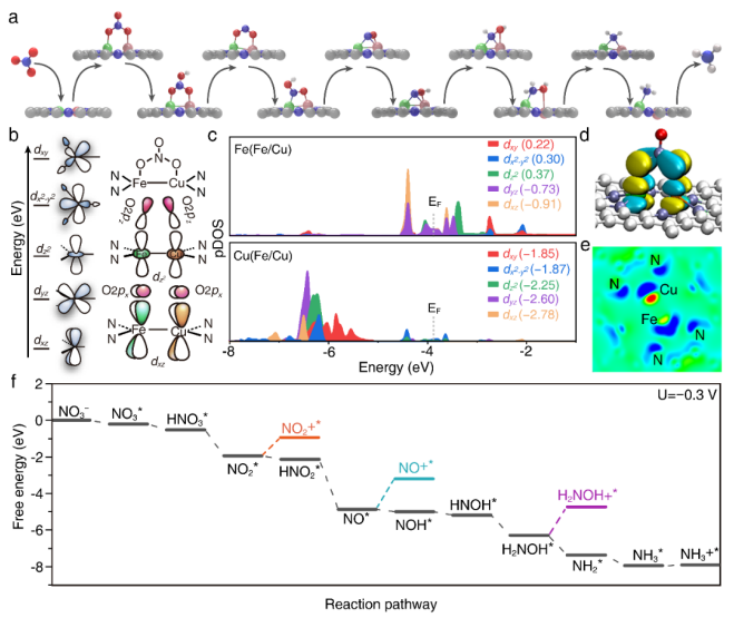 研究团队发现Fe/Cu和NO3–之间存在适当的相互作用,并促进了NO3–阴离子的吸附和产物释放(图1)。NO3–与双金属原子d轨道的强耦合降低了阴离子吸附的能垒,同时双原子可以进一步削弱N-O键,使NH3的生产具有较低的反应能垒。双原子位点也降低了整体反应势垒。