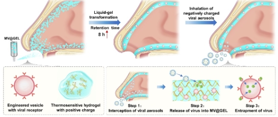 U9彩票生化工程国家重点实验室马光辉院士和魏炜研究员团队基于多年的生物剂型工程研究基础,创制了“鼻内口罩”这种新的防护策略来加强对于病毒气溶胶传播的阻断,该新型“口罩”由携带正电荷的温敏型水凝胶(GEL)与表面高表达病毒受体的微米级细胞囊泡(MV)嵌合而形成保护层(MV@GEL)。病毒气溶胶被吸入鼻腔时,保护层中正电荷的GEL能够拦截并吸附负电荷的病毒气溶胶颗粒,阻断其向下游气管及肺部的传播;而嵌合在凝胶中的MV能够进一步借助表面高表达的受体,诱捕病毒进入囊泡内部使其失活,以此保护鼻腔上皮细胞不被病毒感染。通过上述“拦截”和“失活”的协同作用,大大降低病毒感染的风险。