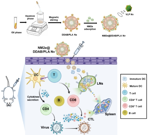 图 NM2e@DDAB/PLA 纳米佐剂疫苗的构建及免疫后的作用模式示意图