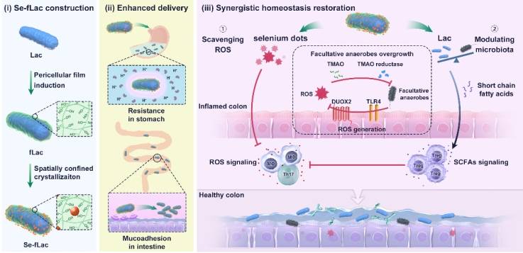 图1. Se-fLac的制备、增强口服递送和协同稳态恢复的示意图