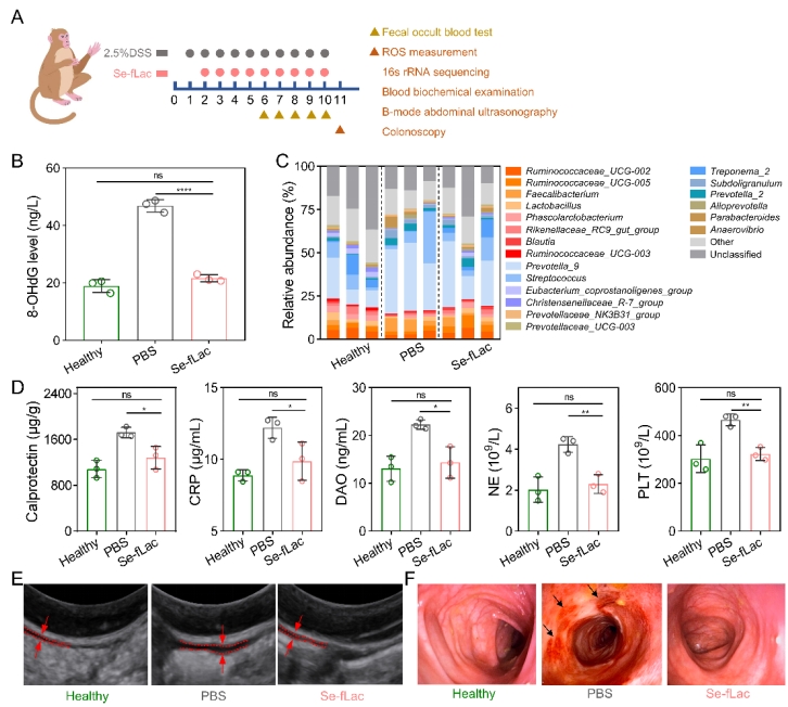 图2. Se-fLac在食蟹猴UC模型中的治疗效果。(A) UC模型建立、治疗和评估的实验设计; (B) 8-OHdG含量的测量; (C) 肠道菌群相对丰度的百分比; (D) 血液和粪便样本中多种炎症相关指标的检测; (E) 腹部B超粘膜层厚度的测量; (F) 显示粘膜层溃疡和出血的结肠镜图像