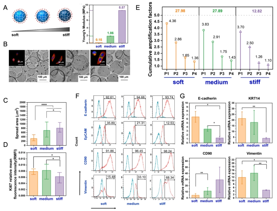 为解决上述问题,研究人员在葡甘聚糖微载体多年研究的基础上,结合仿生羊膜组织硬度的理念,分别制备了硬度为0.15、1.86和8.57 MPa的3种微载体以模拟羊膜、商品化微载体和高硬度培养条件。科研人员发现0.15 MPa的仿羊膜硬度软基质微载体能够更好维持hAECs的表型并促进细胞增殖,从P1代到P4代,累积扩增倍数达27.98,显著优于8.57 MPa的硬基质微载体。相较于传统平板培养,细胞增殖提高了8倍,克服了常规二维培养板的局限性。通过进一步表征发现,仿羊膜硬度微载体有助于上调E-cadherin、KRT14等上皮标志物和下调CD90等间质标志物的表达,表明微载体通过维持hAECs的上皮-间质可塑性(epithelial-mesenchymal plasticity, EMP),有效减缓EMT进程。