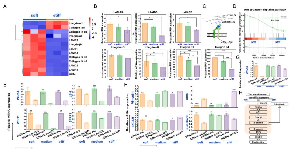 基于上述研究,团队深入探究了影响细胞表型及增殖的内部机制。通过转录组学测序(RNA-seq)分析发现,仿羊膜硬度的软基质微载体能够刺激hAECs分泌层粘连蛋白和胶原蛋白IV等关键细胞外基质(ECM)成分,并富集6、1和4等下游整合素,重塑细胞外微环境,有助于维持基底膜的完整性和稳定性。该过程通过ECM-整合素和Wnt/β-catenin信号通路共同调控EMT进程,有效维持hAECs的上皮属性,并促进其增殖。