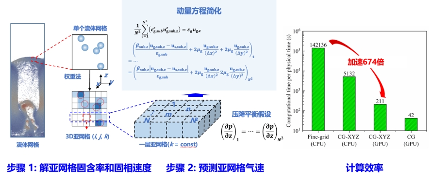 粗粒化离散颗粒模拟因其较低的计算成本且能够获得颗粒运动信息而被广泛用于模拟气固流化床。然而,粗粒化颗粒带来的粗网格导致流体与颗粒作用的预测失真。为了提高精度和求解速度,构建了双重网格法(Aiqi Zhu, et al., Chemical Engineering Journal, 2024, 492: 152218)和亚网格流体与颗粒作用模型。并通过图形处理单元加速求解,模拟速度相比精细网格的模拟快674倍(Xiong et al., Chemical Engineering Journal, 2024, 498: 155042),表明该方法模拟工业气固流化床的有效性。