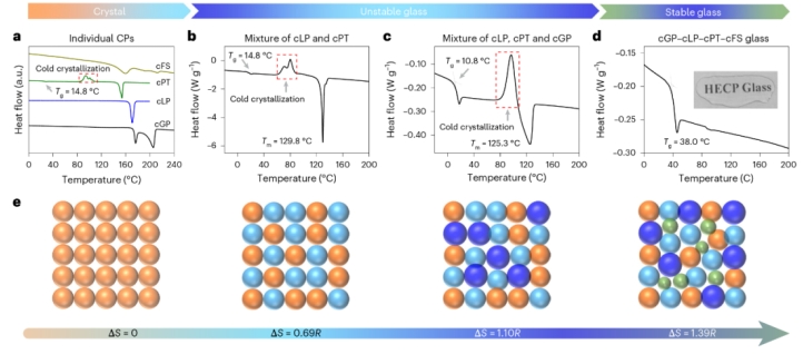 重点进展一:环肽因其刚性骨架结构,具有较高的稳定性、生物活性,以及较强的抗酶解能力,被视为构筑新型生物基材料和药物的理想分子基元。采用高熵策略,首次实现了基于非共价作用的环肽玻璃的创制。这一原理,同样适用于制备其他有机小分子的高熵非共价(HECP)玻璃。HECP玻璃抗结晶性、机械性能和酶耐受性的提升得益于玻璃中分子扩散的减缓和网络连接性的增强。通过对成分的精确调控,可以实现对这些性能的有效调节,这也为环肽药物的可控释放提供了新的可能。此外,HECP玻璃还显示出其整合染料和纳米颗粒等其他功能基团的潜力,为多功能可持续非共价玻璃的设计和开发提供了方案。