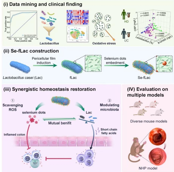 重点进展二:临床现有非甾体抗炎药物以及激素药物对溃疡性结肠炎疗效欠佳或副作用大。基于数据挖掘和临床发现,我们设计创建了工程化益生菌制剂 Se-fLac,协同调控了肠道菌群稳态和氧化还原稳态,其在非人灵长类动物模型上表现优异,为溃疡性结肠炎的治疗提供了新策略。