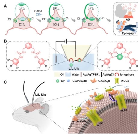 重点进展三:动态监测脑组织中的抑制性神经信号是一项极具挑战的工作,这将有助于推进阿尔兹海默症和癫痫症等神经退行性疾病的发病机理的研究及诊疗方案的确立。开发出一种新型液/液界面超微离电器件(Liquid/liquid interfacial ultramicro iontronics,L/L UIs),首次在阿尔茨海默模型小鼠和癫痫模型大鼠脑内等活体上,对非电化学活性的氯离子(Cl-)实现了高灵敏、抗干扰、可逆、实时动态追踪,初步实现对抑制性神经信号的动态监测。