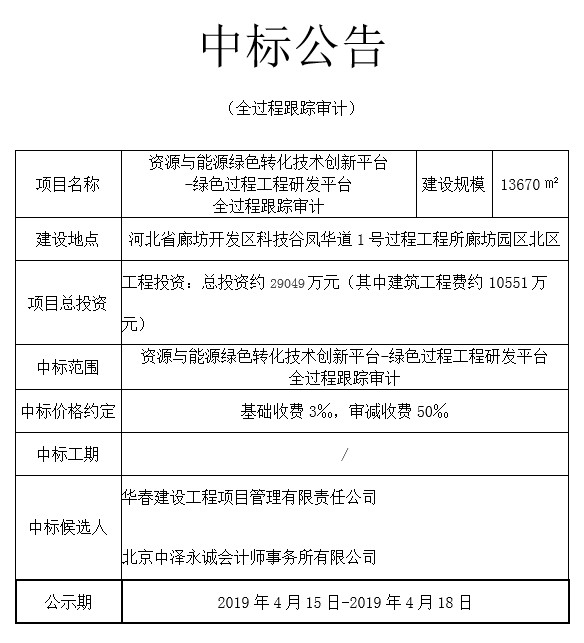 资源与能源绿色转化技术创新平台-绿色过程工程研发平台-全过程跟踪审计中标公告