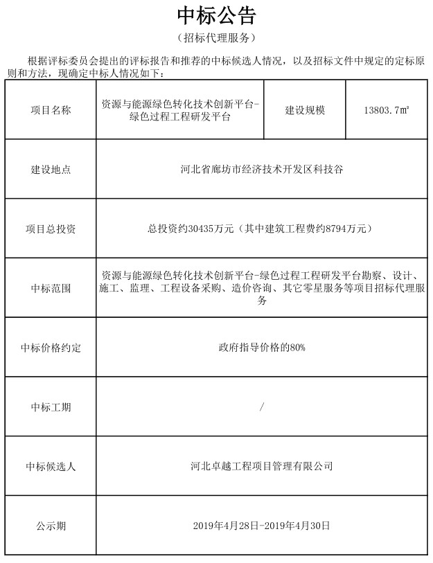 资源与能源绿色转化技术创新平台-绿色过程工程研发平台招标代理服务中标公示