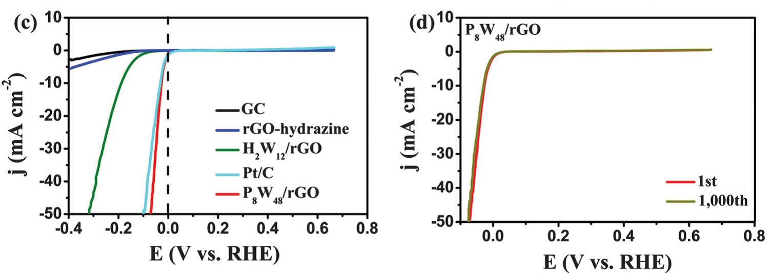 P8W48P8W48/rGO/GC电极表面(“微环境效应”)以及体相溶液中的循环伏安曲线对比:a)负电位极限为P8W488电子还原区域,(b)负电位极限为P8W4816电子还原区域;(cP8W48/rGO与其它催化剂的电催化析氢极化曲线对比;dP8W48/rGO电催化析氢稳定性测试。