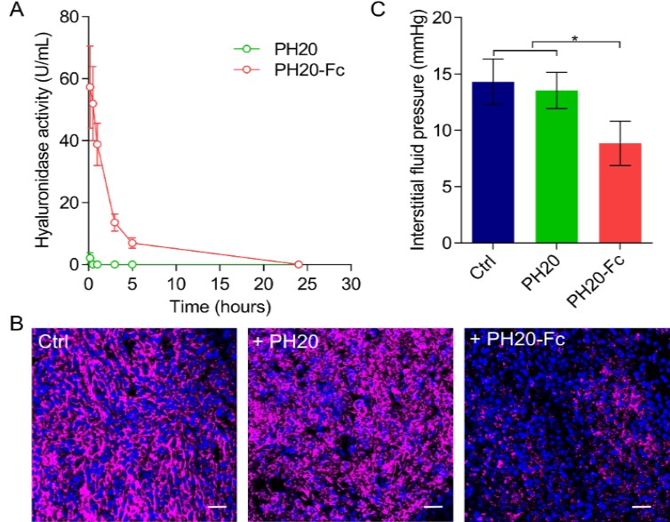 图1 与传统透明质酸酶(PH20)相比,长效透明质酸酶(PH20-Fc)显著延长了体内循环时间(A),成功降解了肿瘤基质中的透明质酸(B),显著降低了肿瘤间质压力(C)