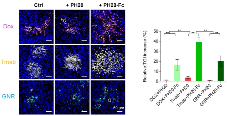 U9彩票生化工程国家重点实验室构建了人源化的长效透明质酸酶分子PH20-Fc,成功地降解了肿瘤微环境中的透明质酸,降低了肿瘤间质压力,打破了瘤内药物递送的关键屏障(图1)。在此基础上,将PH20-Fc分别与三种不同尺寸的典型抗肿瘤治疗药物(阿霉素DOX、曲妥珠单抗Tmab、金纳米棒GNR)进行联合给药,进一步发现PH20-Fc对三种药物的促进扩散程度不同,其中对抗体效果最佳,相应治疗指数提升最多(图2)。该研究不仅为临床上抗肿瘤用药提供了全新的思路,而且有利于指导联合药物的合理搭配,从而更充分加强抗肿瘤药效。