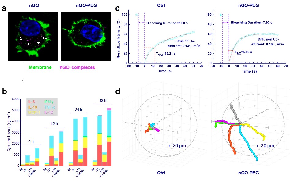 1. nGO-PEG与巨噬细胞作用后的细胞行为变化:(a)巨噬细胞不吞噬nGO-PEG;(b)巨噬细胞分泌大量炎症相关细胞因子;(c)膜流动性加快;(d)细胞迁移速率增加