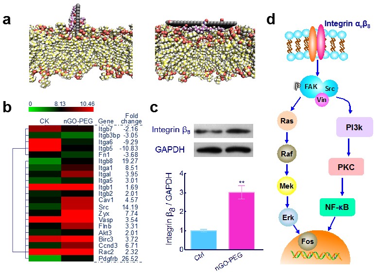 2 nGO-PEG活化巨噬细胞的机制:(a计算模拟揭示nGO与细胞膜的两种作用方式;b)膜相关基因的变化;(cIntegrin β8表达上调;(e)活化通路