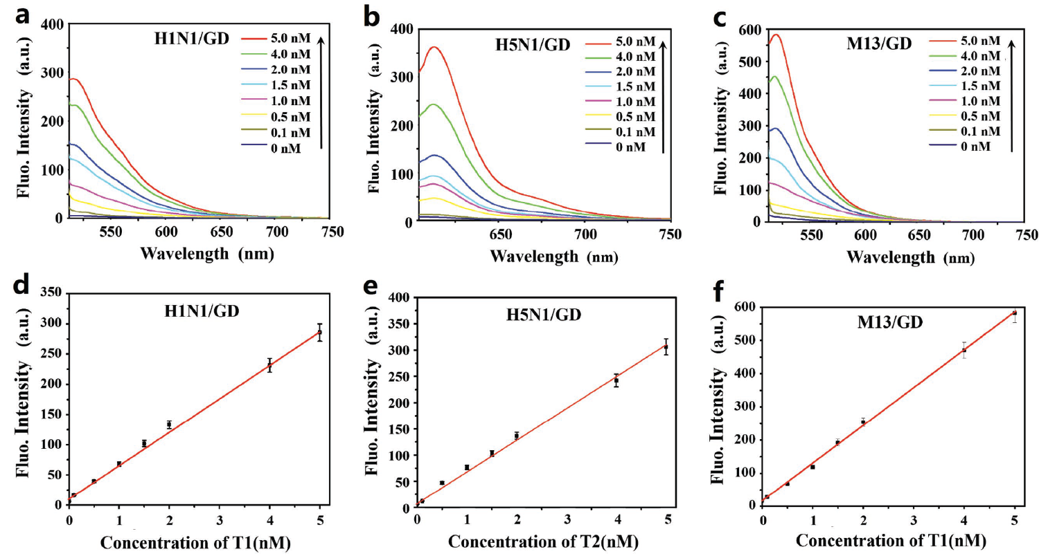 图2. a-c) 不同靶DNA浓度下(T1, T2, T3: 0-5×10-9 M)染料标记的ssDNA的荧光光谱(P1: H1N1-FAM,P2: H5N1-Texas Red,P3: M13-FAM);
