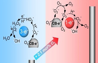 环境技术与工程研究部谢勇冰副研究员研究小组前期发现石墨相氮化碳(g-C3N4催化臭氧-可见光过程具有很强的耦合氧化效应,并揭示了g-C3N4高导带位置对催化性能的重要影响。近期对比一系列碳材料和半导体材料在臭氧、光催化、臭氧-可见光耦合过程的催化活性,验证了臭氧氧化过程中两种不同OH氧化路径,发现g-C3N4价带位置有利于臭氧与空穴竞争捕获光生电子(Carbon, 2016, 107, 658-666)。通过与德国莱布尼兹催化所合作,利用原位电子自旋共振谱定量表征g-C3N4催化臭氧-可见光耦合过程,发现通入臭氧后,电子还原氧气形成超氧自由基(O2)进而产生过氧化氢(H2O2)路径改变为超氧自由基(O2)与臭氧分子反应产臭氧负离子自由基(O3),另外臭氧也易被光生电子快速还原为O3进而提高OH产率和污染物降解效率(ACS Catalysis, 2017, 7, 61986206)。