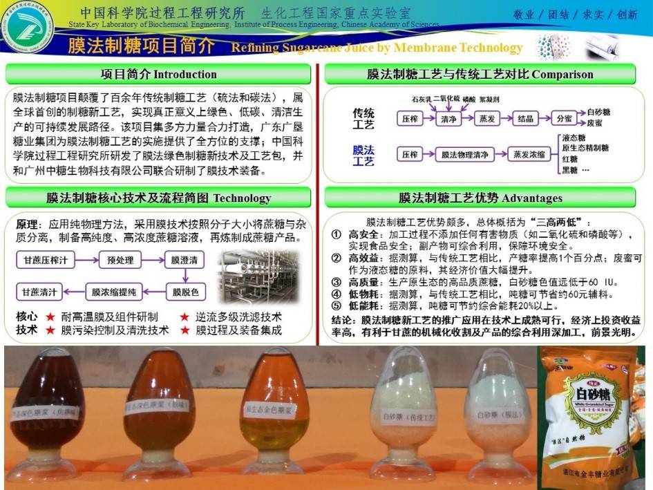 膜法绿色制糖新技术是利用现代膜分离技术变革传统制糖工艺,利用分离膜精确的物理筛分作用,实现甘蔗混合汁的除杂、澄清、脱色和浓缩。该项技术具有不添加有害物质、清净过程高效稳定、副产物可综合利用、产品多元化和可自动化生产等优势,且有利于我国甘蔗机械化采收的推广。利用现代膜分离技术提升传统甘蔗制糖工艺技术水平符合我国鼓励发展的产业政策方向,能够有效推动我国制糖工业转型升级,提升糖业竞争力,实现我国制糖技术跨越式发展并跃居国际领先地位。但是,由于甘蔗混合汁成分复杂,粘度高,在膜分离过程中会造成严重的膜污染和通量衰减,而且目前商业化膜对色素、蔗糖和还原糖分子的分离效果欠佳,蔗糖纯度难以提高,严重地阻碍了膜分离技术在制糖行业的工业化应用。针对这些难题,过程工程研究所万印华研究员团队经过前期多年实验室探索,自2014年起该团队先后在广东、广西多个制糖企业开展了系统的中试研究及系统优化,2018年2月初在广东广垦糖业集团金丰糖业有限公司的膜法精糖中试车间成功实现了全套装置的连续化稳定运行,在国内率先试制出首批膜法精糖。这标志着膜法绿色制糖新工艺技术路线已彻底打通,也意味着制糖业将有望告别硫磺、磷酸及石灰等化工辅料,实现纯物理过程生产,并可完全消除滤泥、废糖蜜副产品在综合利用时所产生的污染,具有良好的经济和社会效益。