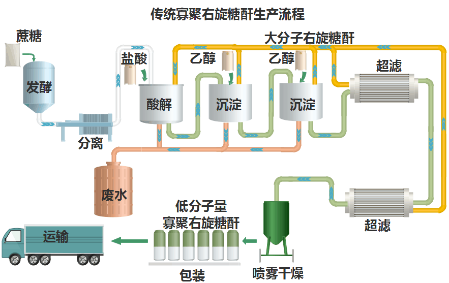 在传统的寡聚右旋糖酐生产过程中,葡聚糖蔗糖酶用于上游发酵得到高分子右旋糖酐,再通过初步分离把分子量高达数百万道尔顿的大分子右旋糖酐移出反应体系。在强酸的条件下大分子右旋糖酐的糖苷键被随机打断,产生链长较短的低分子量寡聚右旋糖酐。为了得到目标分子量的产物,要进行多次乙醇沉淀。对于药用的寡聚右旋糖糖酐,成品前还需要通过多级纯化最后喷雾干燥才能包装成品。这种生产工艺得到的寡聚右旋糖酐产品分子量不均一,还引入多种杂质,会造成临床上的免疫风险。同时生产过程中乙醇消耗量大,产生大量难处理的高盐废水,给环境治理带来极大的负担。
