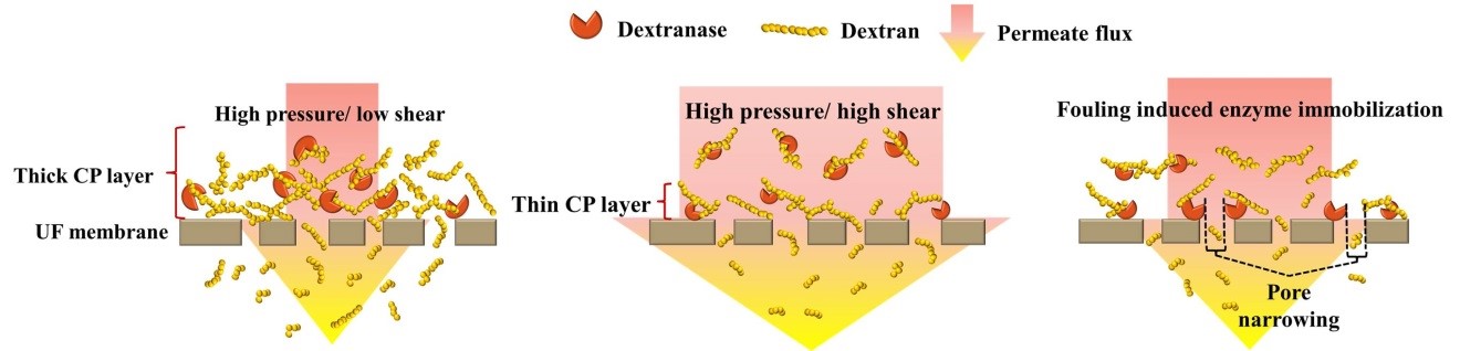 中科院过程工程研究所生化工程重点实验室万印华研究员团队构建了酶膜反应器,以大分子右旋糖酐(40.0 kDa)为底物,使用酶解法替代传统的酸解法,并采用超滤技术对寡聚右旋糖酐进行在线分离,避免目标产物的进一步水解,通过调控酶膜反应器的过滤行为控制产品的分子量,提高其均一性。在生产过程中,右旋糖酐酶和右旋糖酐均会对超滤膜造成不可逆污染。基于膜污染的机理,利用超滤膜对右旋糖酐酶溶液进行预过滤,不仅实现了部分酶在膜表面的固定化,还可调节膜孔径分布,并透过杂蛋白从而提高酶比活力,从而构建出一种半固定化新型酶膜反应器。这种酶膜反应器生产的寡聚右旋糖酐分子量均一性更好,产品质量更高。