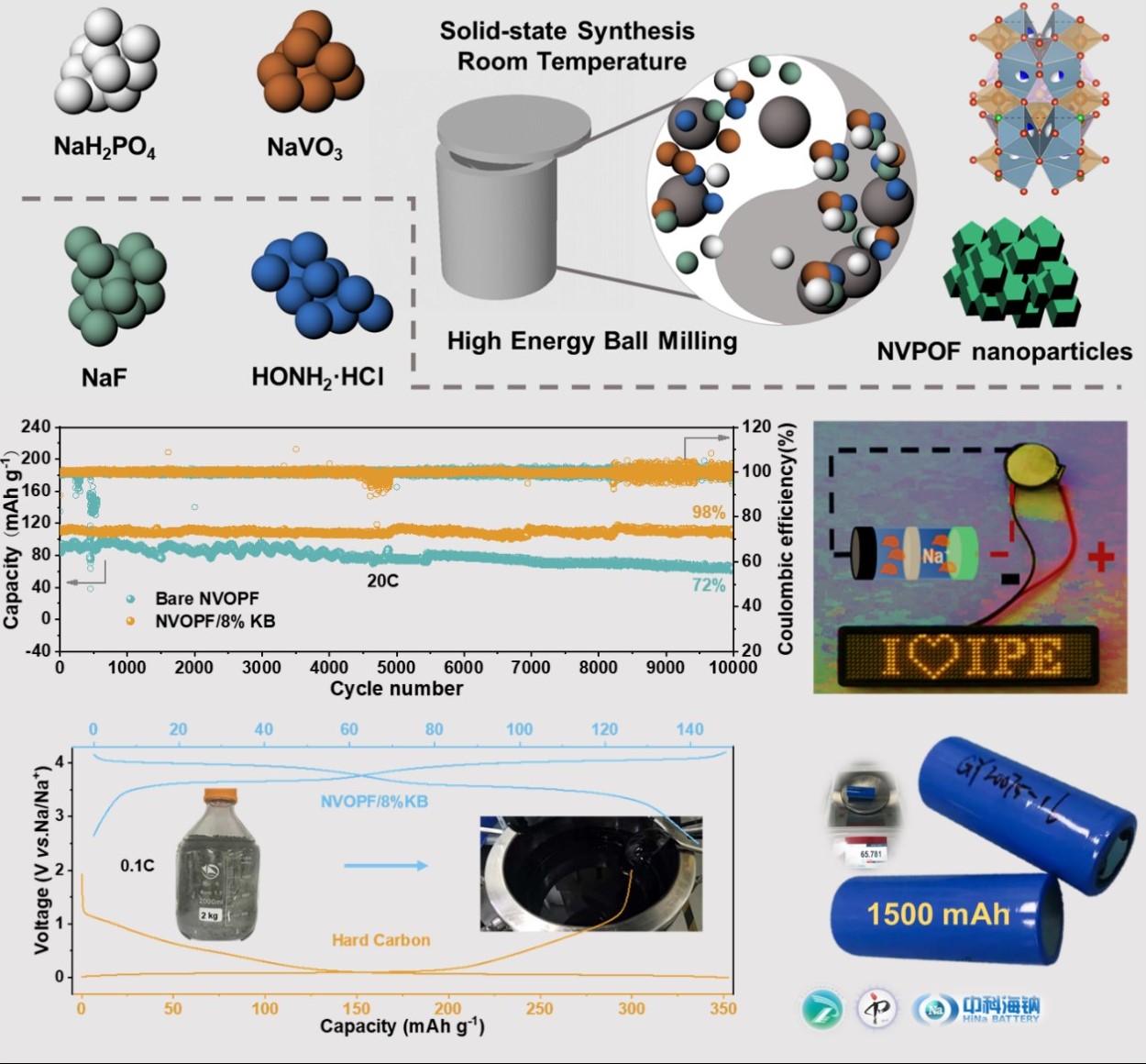 自1999年法国科学家J.-M. Le Meins发现以来,氟磷酸钒钠的合成一直采用高温固相法,高能耗带来的高昂成本以及欠充分发挥的电化学性能限制了该类材料的产业化应用。U9彩票赵君梅研究员团队长期致力于NVPFs的低成本绿色合成及性能提升,近年来获得了多项专利技术和研究成果。团队率先以降低能耗和形貌调控为出发点,采用水热/溶剂热合成氟磷酸钒钠,对材料的充放电机理进行了系统研究,并在此基础上创新性开发了一步室温可控制备多壳层氟磷酸钒钠微球技术(Joule 2018, 2(11): 2348-2363),降低该材料生产能耗的同时提升了其性能。然而,液相反应会受到原料/产物溶解度、pH等多参数调控的限制。基于此,团队率先开发出无溶剂的机械化学法快速制备含碳NVPFs复合物,因能实现原位碳骨架的构建,界面反应得以强化。该制备方法可将液相法的7天生产时间缩短至30分钟,产品倍率性能和循环稳定性得到极大提升,保证了工业应用的生产效率。令人惊喜的是,产品公斤级放大组装的商业级26650圆柱电池证实了其高功率和长循环特性。相关研究成果发表于Nature Communications。
