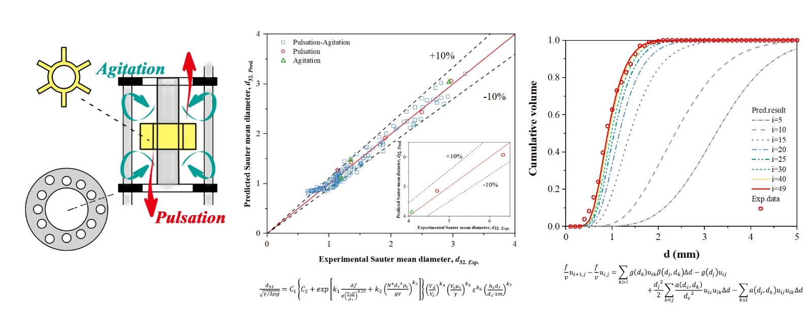 齐涛研究员、王勇研究员团队通过向萃取塔内同时引入高速径向搅拌和轴向脉冲两种外部能量,提高了分散相液滴的充分破碎-聚并频率,强化了液液两相间的物质传递;结合特定结构塔板,在保证液-液两相的逆流流动的同时,抑制了轴向的返混程度。阐明复杂流场中分散相液滴的演化行为、液-液两相的非均匀流动和传质强化机制是实现萃取塔的可靠量化设计的关键。研究团队从液滴的破碎与聚并角度出发,通过高速摄像技术获取单液滴和液滴群行为的实验数据,进一步建立了描述萃取塔内液滴直径演化的群体平衡模型,与Coulaloglou & Tavlarides液滴聚并-破碎核函数相耦合,得到了液滴直径和分布随塔高变化规律,破解了萃取塔内分散相液滴群随塔高演变无法准确预测的难题。该成果发表于AIChE Journal, 2020, 66: e16279。