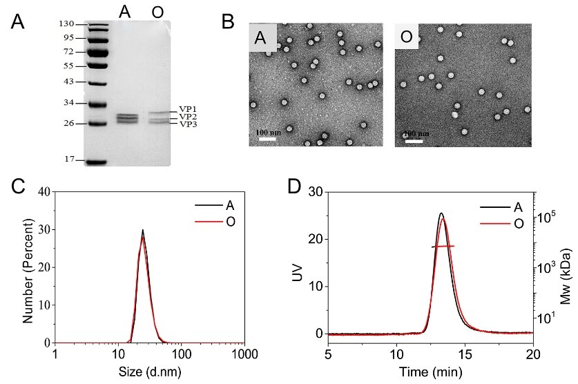 图1:A型和O型FMDV的(A)电泳、(B)透射电镜、(C)DLS粒径分析、(D)HPSEC-MALLs分子量分析