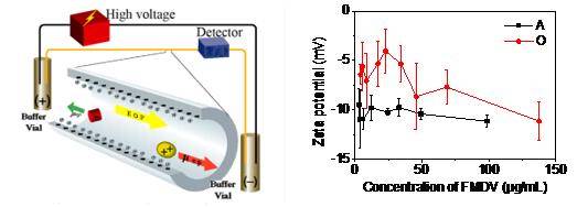 针对上述挑战,在HPSEC检测技术基础上,该研究团队提出利用CZE对多价口蹄疫病毒疫苗抗原FMDV同时进行O型、A型完整病毒的定量检测。CZE的分离机制主要是在外加电场存在的情况下,基于不同组分的荷质比差异进行分离(图2A),在病毒及病毒样颗粒等大分子生物样品分析检测方面具有独特的优势和广阔的应用前景。